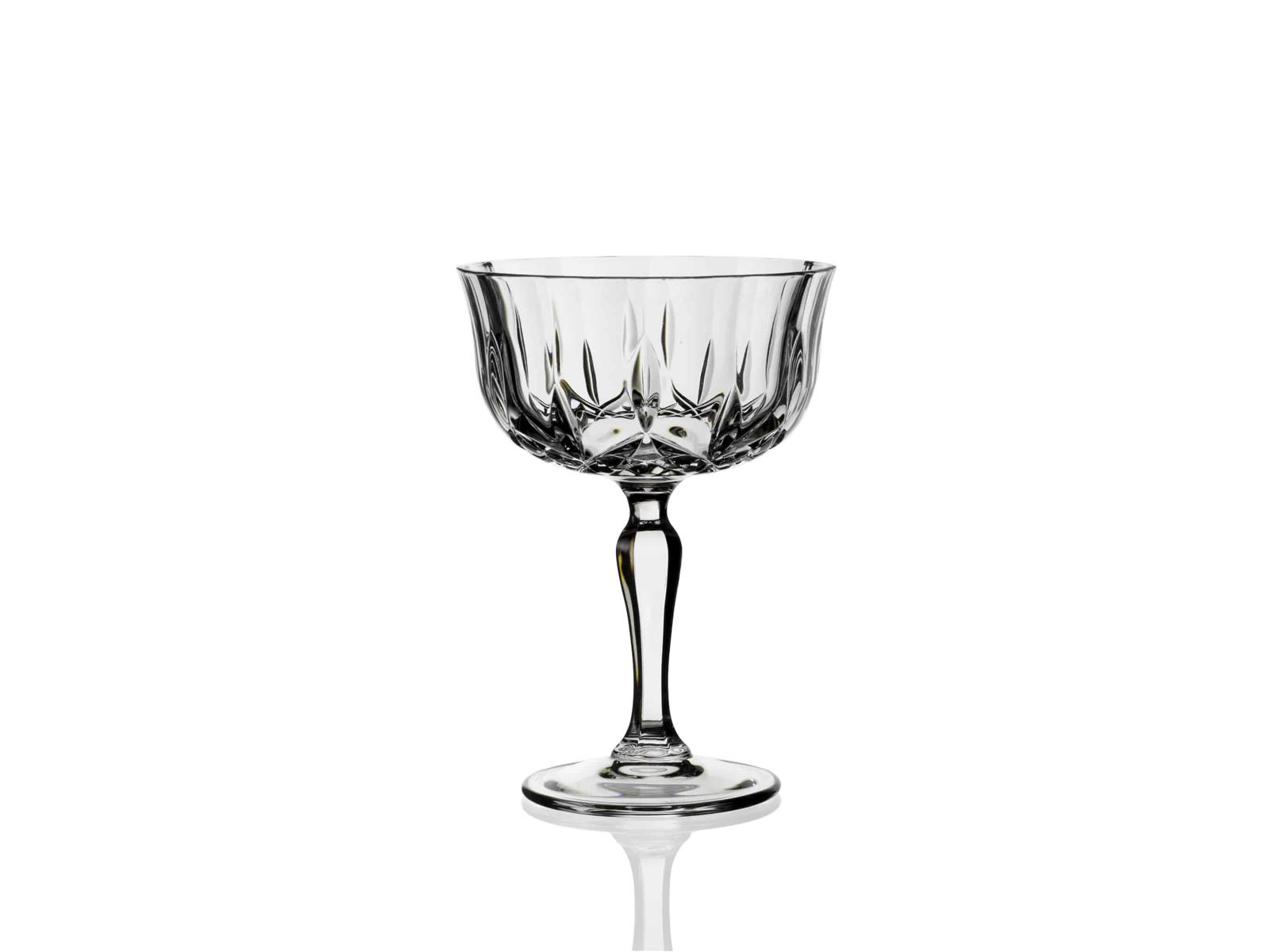 Lavet af Luxion Krystalglas, markedets mest bæredygtige glas. Italienske RCR er kendt for sit flotte design og ikke mindst deres unikke bæredygtige produktion, hvor der kun anvendes vedvarende energikilder. Krystalglasset er naturligvis lavet af blyfri glas, men er stadig blandt det mest holdbare og klareste krystalglas på markedet. Med dette elegante coupeglas kan du servere flotte cocktails, hvor der er god plads til garnish. Et klassisk glas til en lang række klassiske cocktails! Det åbne design er også oplagt til champagne, hvor man kommer helt tæt på en større overflade af champagnen end i et klassisk champagne flute. Det giver en lidt anden smagsoplevelse af champagnen, som bestemt er værd at afprøve om det er den måde man selv foretrækker de gyldne dråber på
