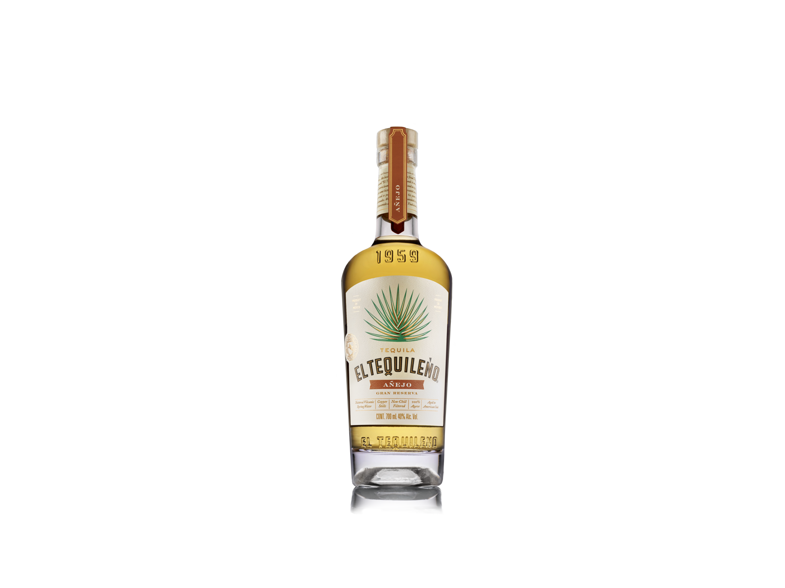 • El Tequileño Añejo Gran Reserva er 100 % estate-dyrket blå agave - lagret i mindst 18 måneder på amerikansk og fransk egetræ og harmonisk blandet med Extra Añejo for en langvarig eftersmag.